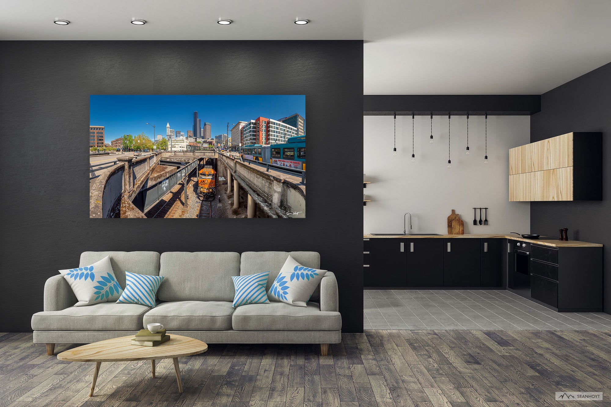 blue busses cityscapes Seattle skyline trains Washington
