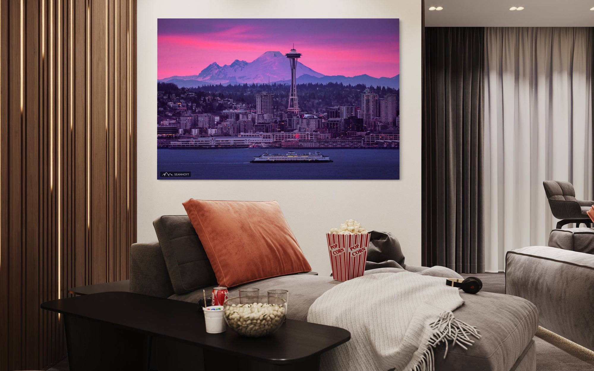 blue city cityscapes clouds elliot bay ferries landscapes magenta Mount Baker national parks pink purple Seattle Seattle Trifecta Space Needle sunrises & sunsets vertical Washington water