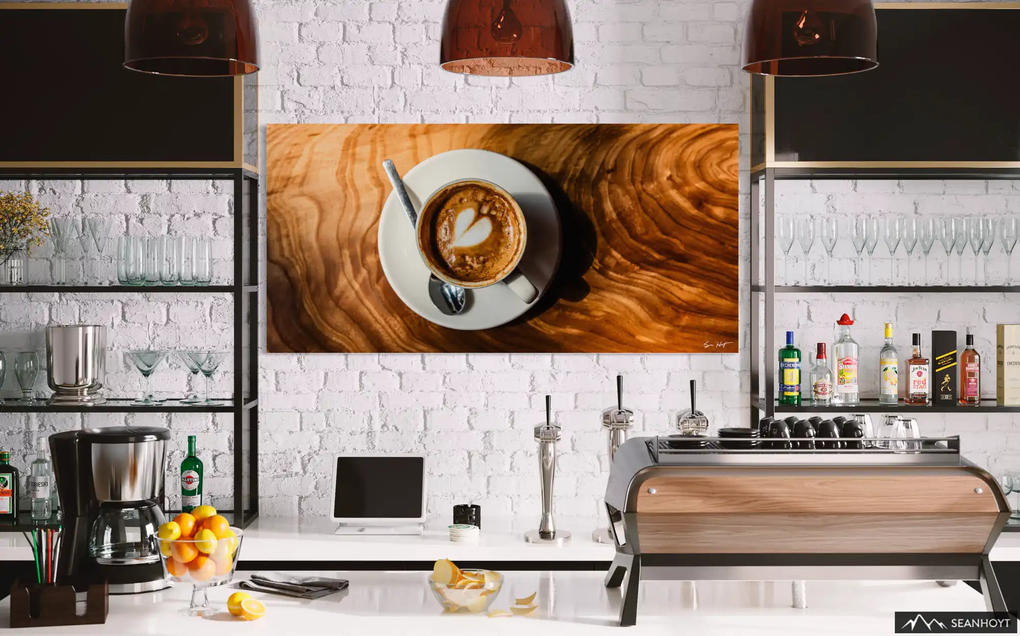 When I think of being cozy, my mind drifts to a comfy leather armchair, a perfect latte awaiting its first sip atop a warm-tone walnut table, and the dimly-lit atmosphere of the cafe with a subtle soundtrack in the background. It's food for a creative effort which you can put on your walls as you work from home in your PJs.